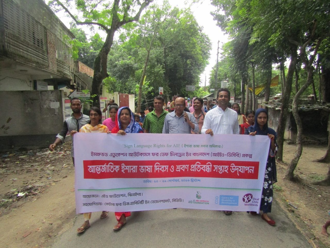 এইড ফাউন্ডেশন কর্তৃক বাস্তবায়িত “ Improved Education Outcomes For Deaf children In Bangladesh (IEO-DCB )” প্রকল্পের আওতায় আন্তর্জাতিক ইশারাভাষা দিবস ও শ্রবণ প্রতিবন্ধী সপ্তাহ, ২০১৯ উদ্যাপন উপলক্ষে সপ্তাহ ব্যাপী বিভিন্ন অনুষ্ঠানের আয়োজন করা হয়। ০৮ আশ্বিন ১৪২৬ বঙ্গাব্দ (২৩ সেপ্টেম্বর ২০১৯ খ্রিস্টাব্দ) সকাল ১০.০০ টায় এক বণার্ঢ্য শোভাযাত্রা ও আলোচনা সভার মাধ্যমে অনুষ্ঠানের সূচনা হয়। পরবর্তীতে ইশারা ভাষা প্রতিযোগিতা, ক্রীড়া প্রতিযোগিতা, শিশু সুরক্ষা সেশন, ইশারা ভাষা সেশন এবং আজ ১৪ আশ্বিন ১৪২৬ বঙ্গাব্দ (২৯ সেপ্টেম্বর ২০১৯ খ্রিস্টাব্দ) সকাল ১০.০০ টায় ঝিনাইদহ প্রেসক্লাবে প্রতিবন্ধী নারীদের সামাজিক নিরাপত্তা এবং “প্রতিবন্ধী ব্যক্তির অধিকার ও সুরক্ষা আইন-২০১৩” সফল ভাবে বাস্তবায়নের দাবিতে সাংবাদিক সম্মেলন এবং মানব বন্ধন কর্মসূচির মাধ্যমে আন্তর্জাতিক ইশারাভাষা দিবস ও শ্রবণ প্রতিবন্ধী সপ্তাহ-২০১৯ উদযাপন সমাপ্ত হয়।