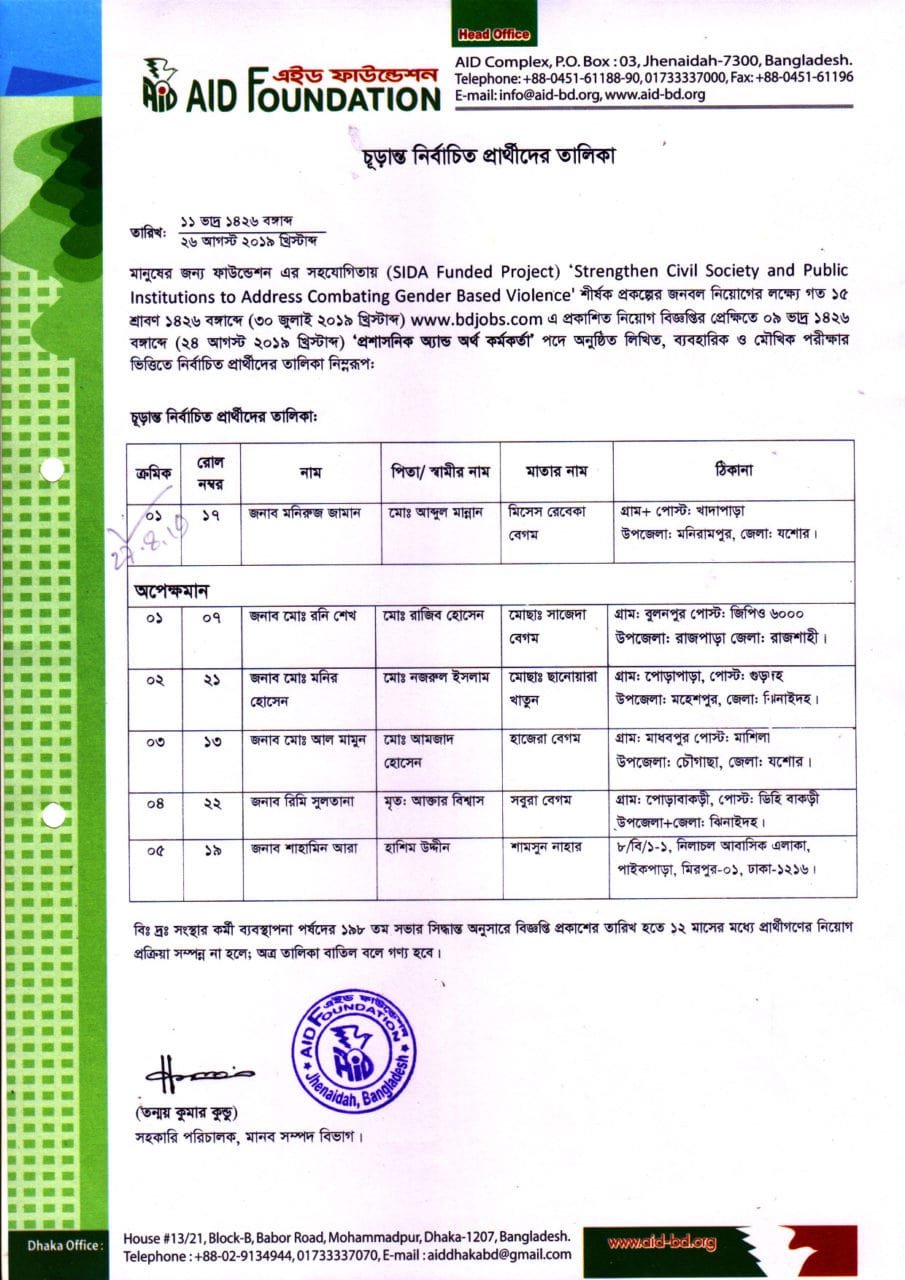 ‘প্রশাসনিক অ্যান্ড অর্থ কর্মকর্তা’ পদে নিয়োগ পরীক্ষার ফলাফল