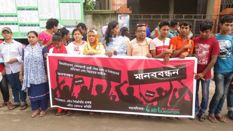 ১৩ শ্রাবণ ১৪২৬ বঙ্গাব্দ (২৮ জুলাই ২০১৯ খ্রিস্টাব্দ) ঝিনাইদহ পোস্ট অফিস মোড়ে সকাল ১০ টায় ‘ঝিনাইদহসহ দেশব্যাপী নারী-শিশু ধর্ষণ ও নির্যাতনের প্রতিবাদ এবং বিচারের দাবীতে মানববন্ধন’ কর্মসূচি অনুষ্ঠিত হয়। উক্ত কর্মসূচিতে এইড ফাউন্ডেশন বাস্তবায়িত জেন্ডার ভিত্তিক সহিংসতা প্রতিরোধ ও মোকাবেলা প্রকল্প, এইড জেন্ডার কমিটি, জেলা মানবাধিকার ফোরাম, এডাব ঝিনাইদহ জেলা