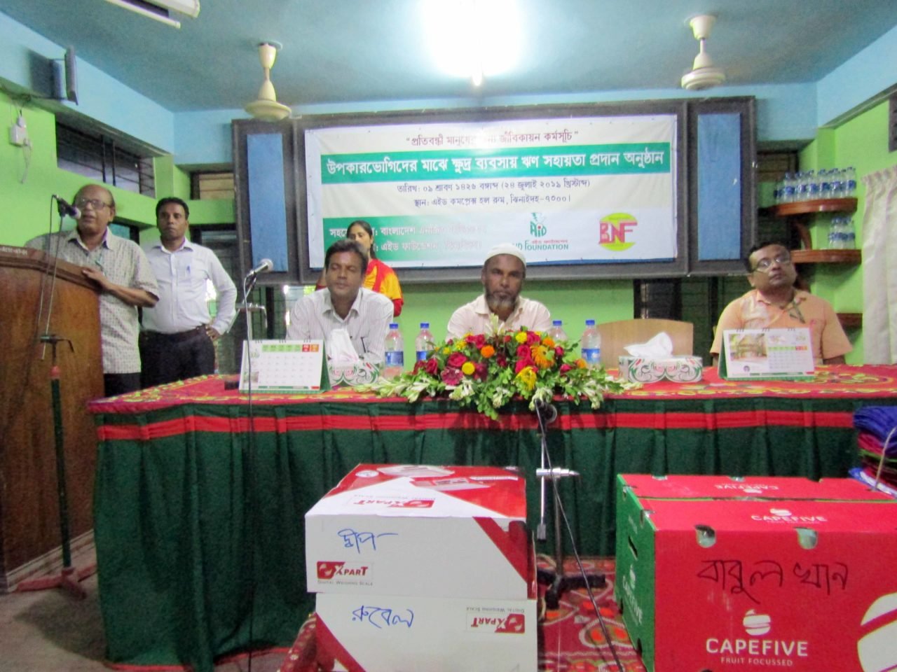 বাংলাদেশ এনজিও ফাউন্ডেশন এর অর্থায়নে, এইড ফাউন্ডেশন কর্তৃক বাস্তবায়নাধীন ‘প্রতিবন্ধী মানুষের জন্য জীবিকায়ন কর্মসূচি’ প্রকল্পের আওতায় ১৪ জন উপকারভোগীর মাঝে ক্ষুদ্র ব্যবসার উপকরণ সহায়তা প্রদান উপলক্ষে ০৯ শ্রাবণ ১৪২৬ বঙ্গাব্দ (২৪ জুলাই ২০১৯ খ্রিস্টাব্দ) বুধবার সকাল ১১.০০ টার সময় এইড কমপ্লেক্স হল রুম ঝিনাইদহে আলোচনা সভা ও উপকরণ বিতরণ অনুষ্ঠানের