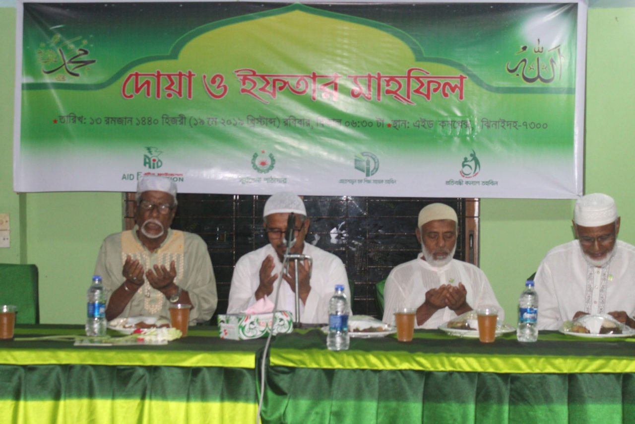 পবিত্র মাহে রমজান উপলক্ষে এইড ফাউন্ডেশন, সূর্যসেনা পাঠাগার, এহতেশামুল শিক্ষা সহায়ক তহবিল এবং প্রতিবন্ধী কল্যাণ তহবিল এর যৌথ উদ্যোগে এইড কমপ্লেক্স এ অদ্য ১৩ রমজান ১৪৪০ হিজরী (১৯ মে ২০১৯ খ্রিস্টাব্দ) রবিবার দোয়া ও ইফতার মাহফিল অনুষ্ঠিত হয়। দোয়া ও ইফতার মাহফিলের পূর্বে সার্বিক কল্যানার্থে ঝিনাইদহের কলাবাগান হাফেজিয়া মাদ্রাসার শিক্ষার্থীরা